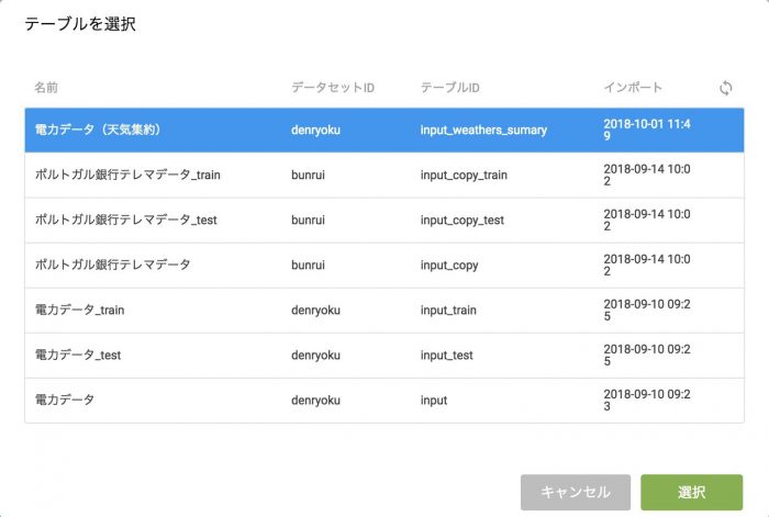 ※ここで選択するデータは学習用に分割する前のデータでも大丈夫です。keyという項目が入っていても大丈夫なように実装してもらいました。