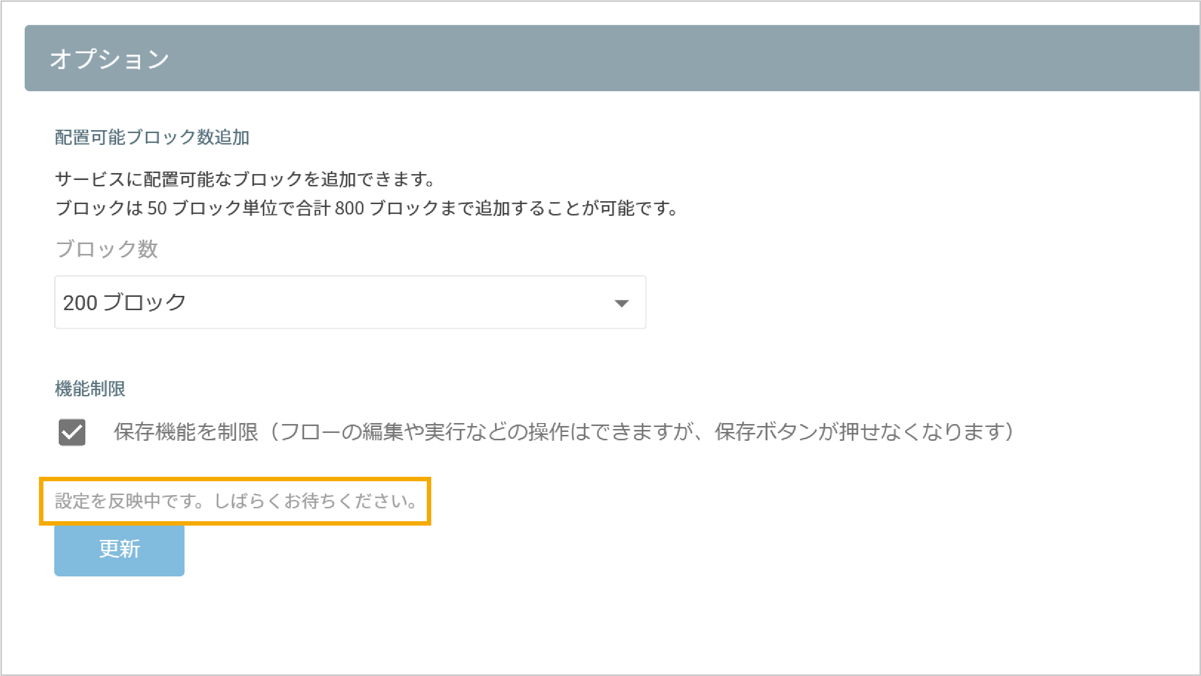 1つのフローデザイナーに配置可能なブロック数は、50ブロック単位で自由に変更可能です。ただし追加に関しては、追加50ブロックあたり1つのフローデザイナーのライセンスが別途必要です。