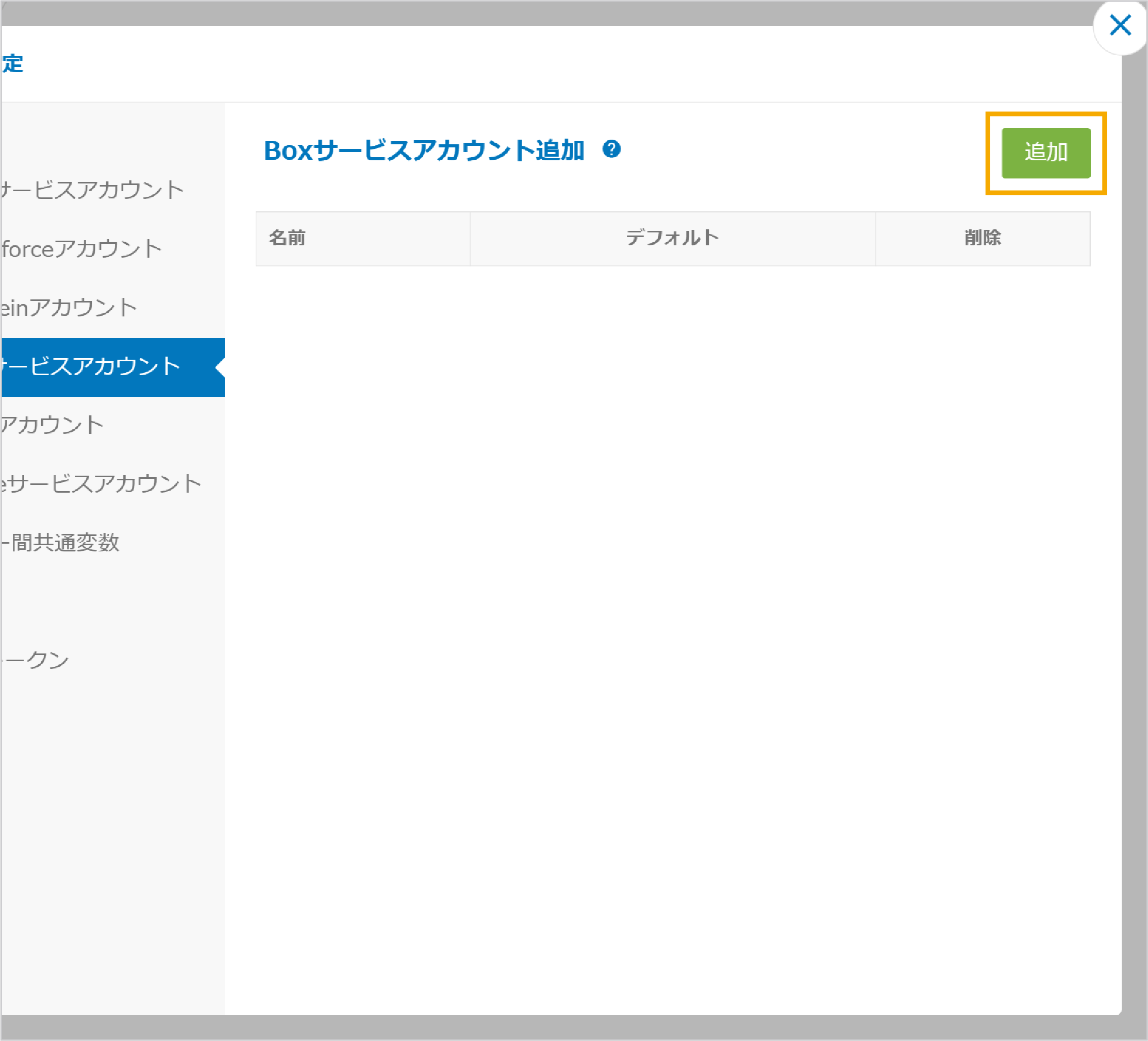 フローデザイナーでBoxカテゴリーのブロックを利用するためには、Boxサービスアカウントが必要です。