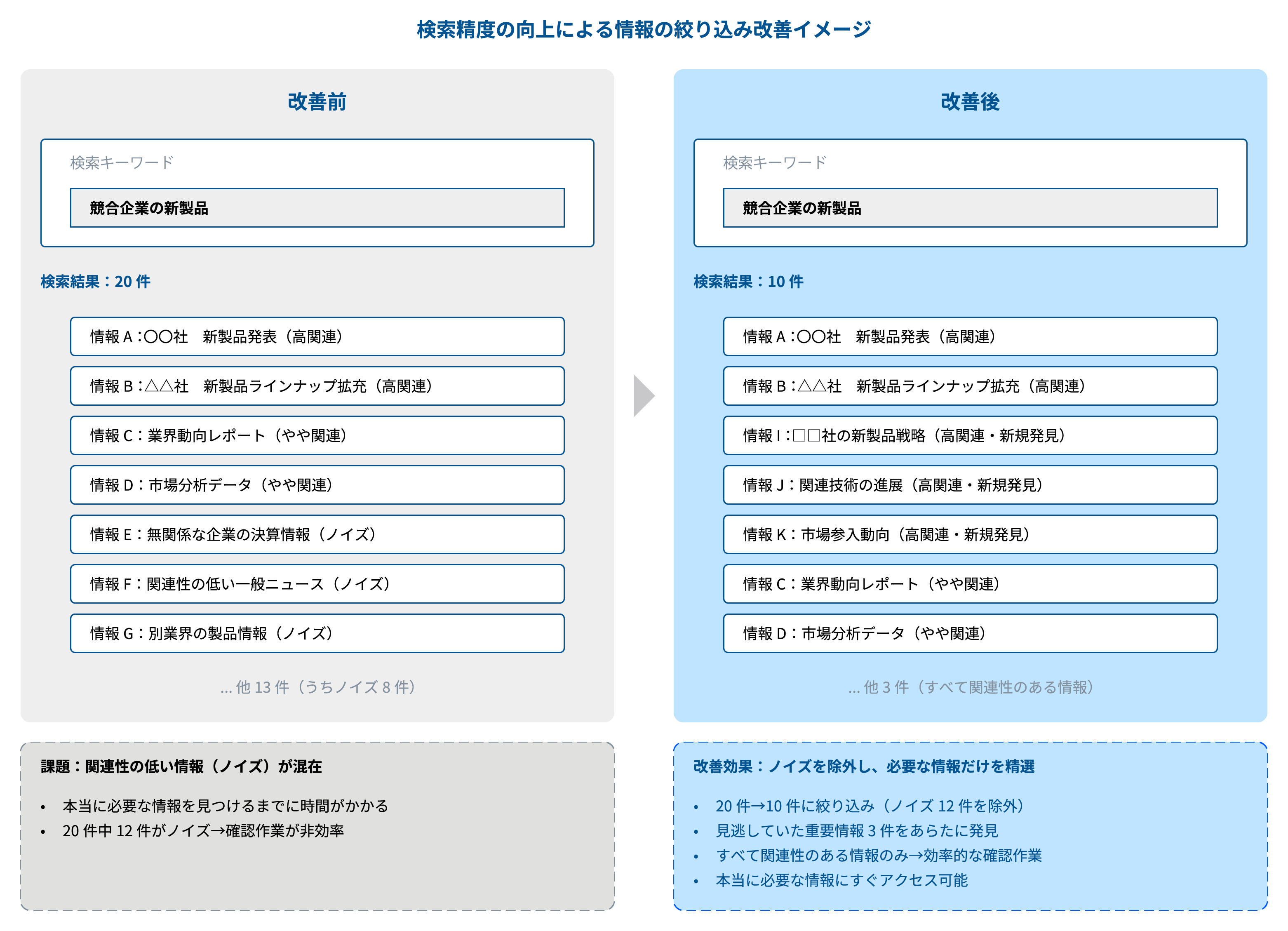 業界動向や競合企業の動きを網羅的に把握する際、関連する情報を漏れなく発見できます。検索条件を絞り込んでも、文脈的に関連する重要な情報を見逃すことがなくなり、より精度の高い市場分析が可能になります。