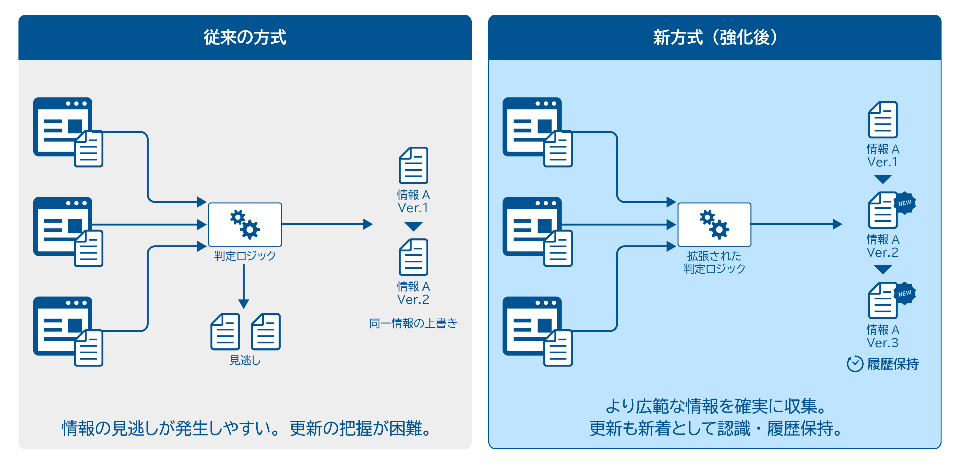 判定基準の拡張により同一の情報が変更された場合でも新着として認識・保存されます。 - 履歴の保持: