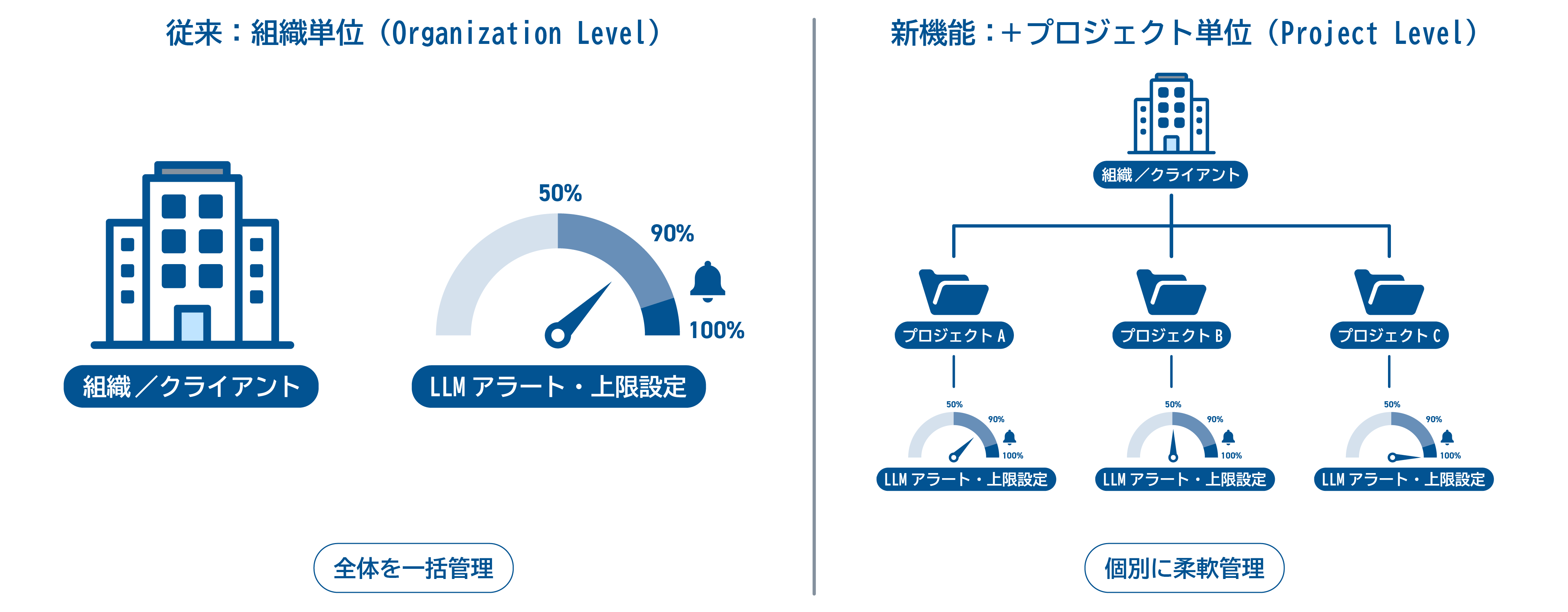 これにより、プロジェクトごとにLLMトークン数の上限とアラートの通知しきい値を設定できるようになりました。従来の組織単位の設定に加えて、プロジェクト単位での設定が可能になることで、より柔軟なLLM利用量の管理を実現します。組織全体のガバナンスを維持しつつ、各プロジェクトに合わせた理想的な管理体制を構築可能です。